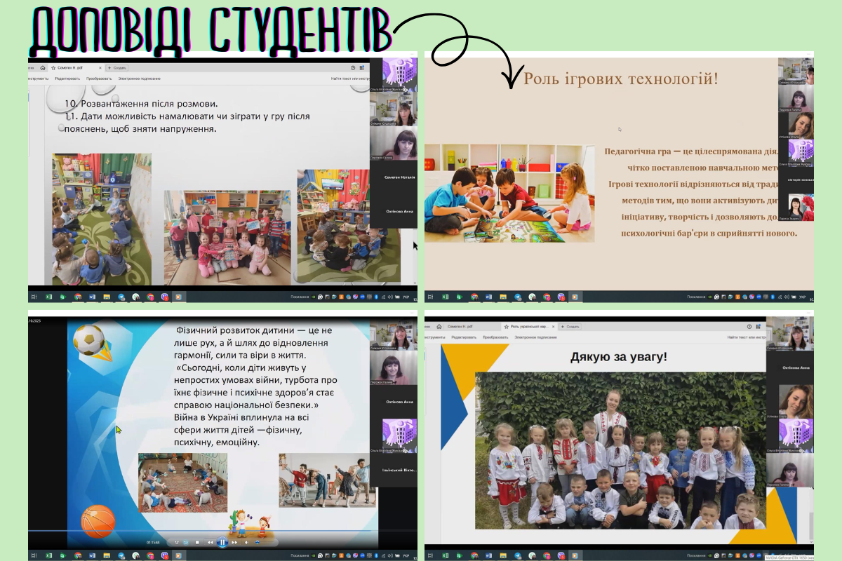 - «Фізичний розвиток дітей дошкільного віку в сучасних умовах (під час війни)» — студентка 231 групи Анастасія Охтінова, викладачка методики фізичного виховання Зварич Л. Ю.;